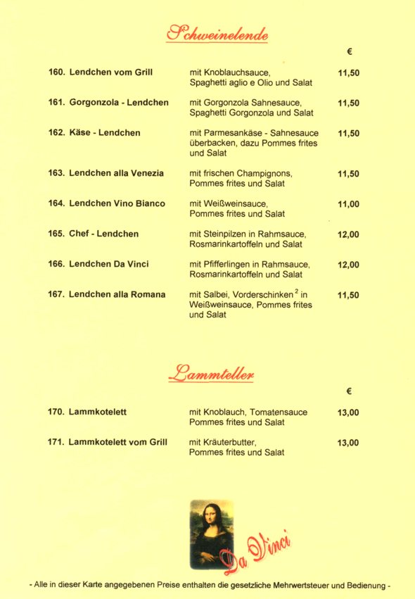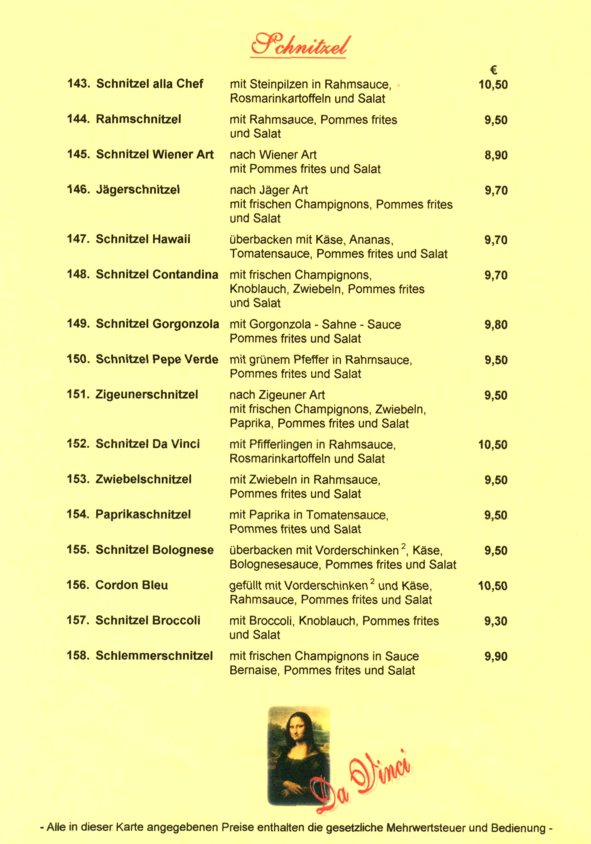 Das Da Vinci ist ein Ort der gepflegten Gemütlichkeit, ein Ort, an dem man sich sofort wohl fühlt. Die freundliche Atmosphäre, der helle, schön dekorierte Gastraum und der gemütliche Biergarten sorgen für angenehme Stimmung. Die Küche ist unverkennbar italienisch - mit seinem Hang zu deutschen Gerichten. Das belegt die Schnitzelkarte, die viele leckere und deftige Varianten zu bieten hat.